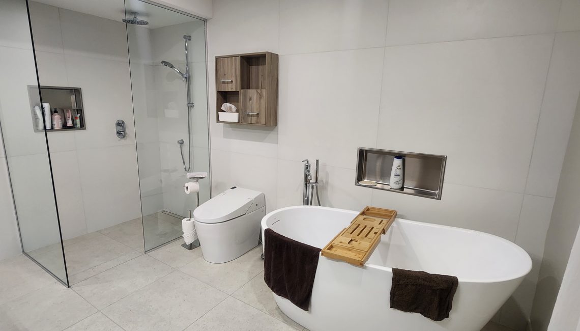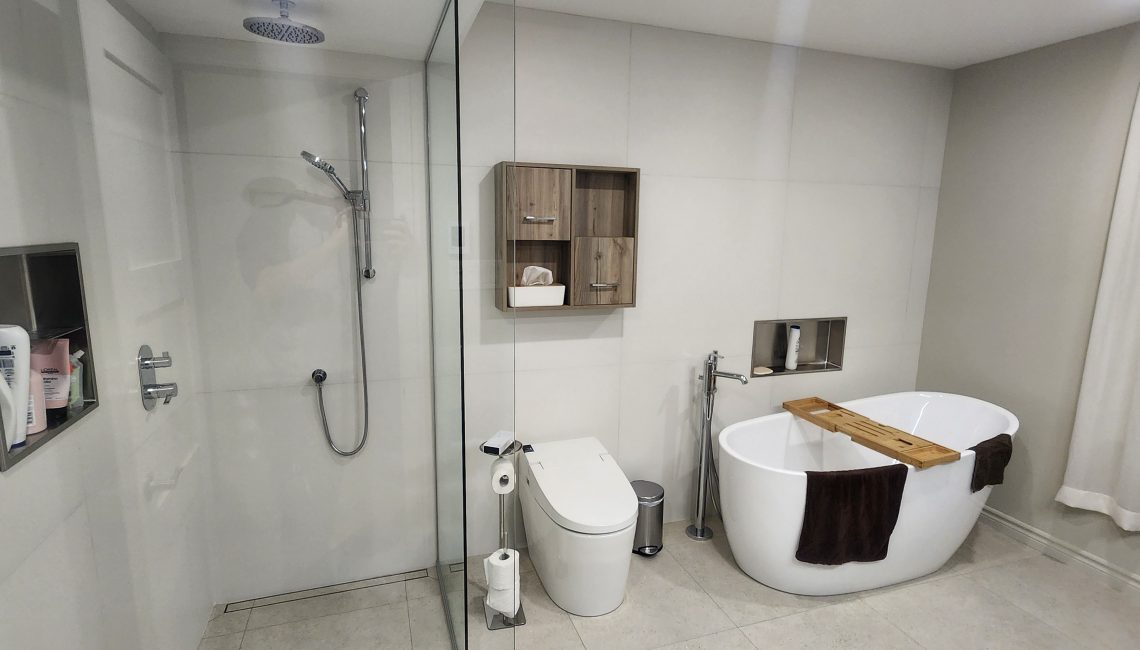- Baignoire autoportante : Une baignoire autoportante a été ajoutée, créant un espace parfait pour la détente.
