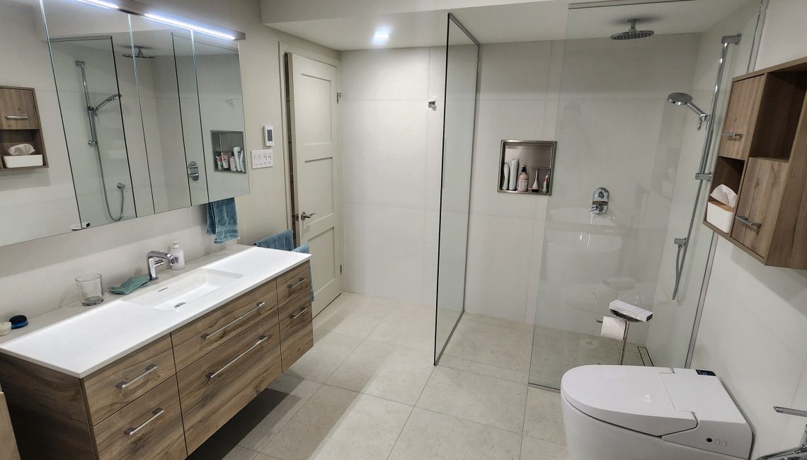 - Vanité en maronyx : Une nouvelle vanité en maronyx a été installée, combinant un design moderne avec un fini effet bois chaleureux. Elle offre beaucoup de rangement et s’intègre parfaitement au style de la salle de bain.